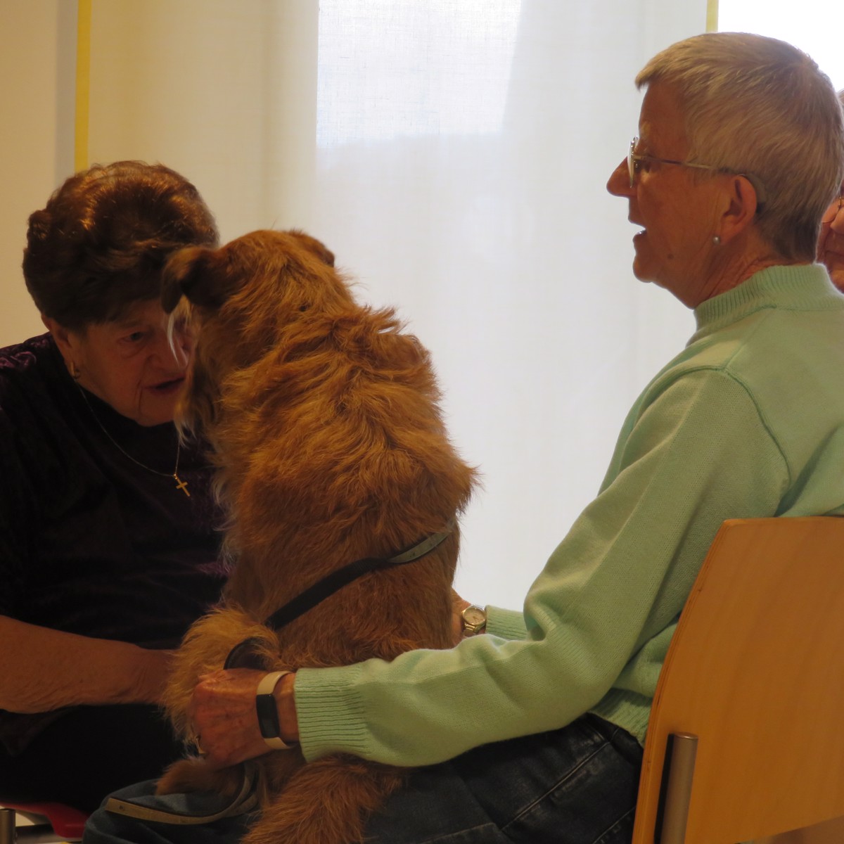 Mit dem Therapiehund Aipri bieten wir unseren Bewohnerinnen und Bewohnern die Möglichkeit, wieder in (direkten) Kontakt mit einem Hund zu kommen und ihr Wohlbefinden merklich zu steigern. Diese «alle-Sinne-aktivierende-Begegnung» lässt sehen, wieviel Freude und Glück, Abwechslung und Spannung, Emotionen und Erinnerungen in der kurzen Zeit eines Besuches möglich sind.